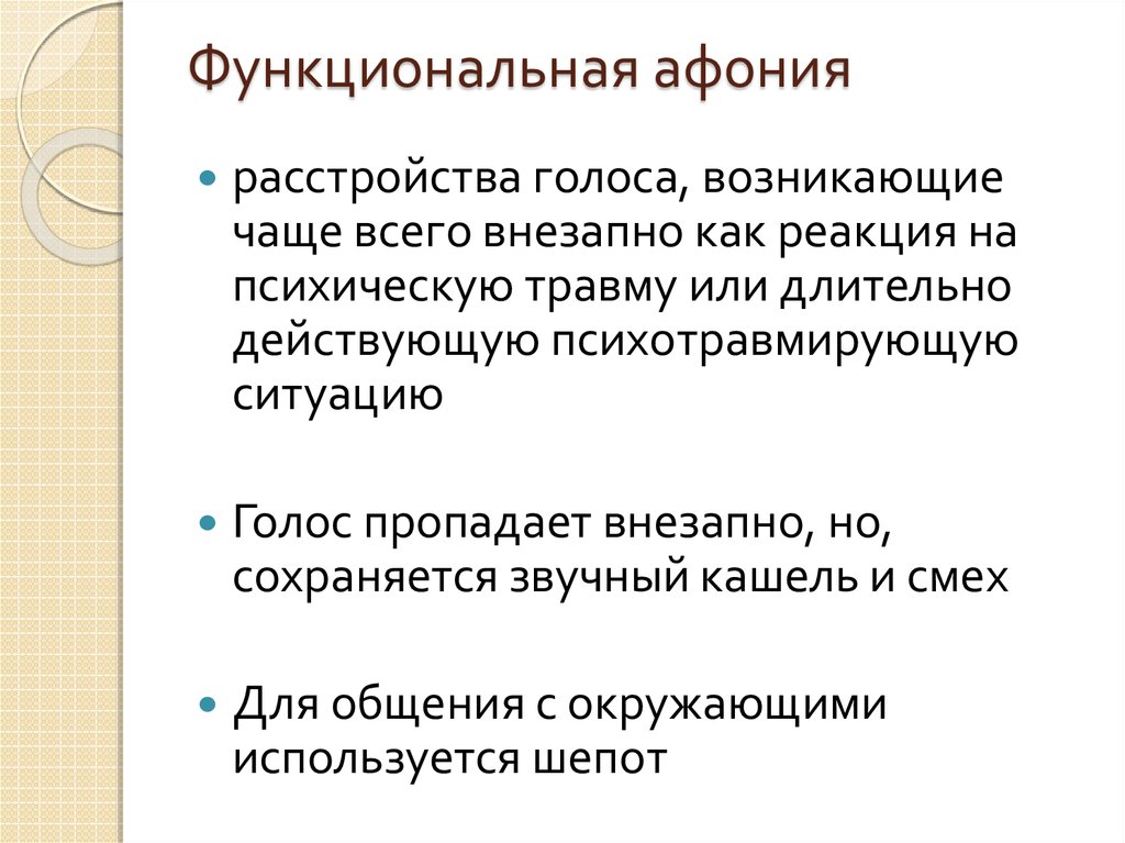 Нарушения голоса функционального типа, так же как и органические, бывают периферического и центрального вида. Афония голоса может возникнуть при психотравмирующей ситуации. Такое расстройство речи относят к центральным функциональным нарушениям. Чаще всего оно возникает у представительниц слабого пола, которые склонны к невротическим расстройствам.