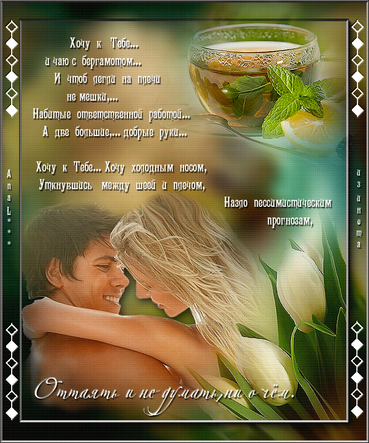 Сладкая нега накрывает меня при мыслях о тебе. Предвкушаю совместный вечер наедине. Только свечи, лёгкий шёпот, аромат цветов. И ты, моё солнышко! Хочу почувствовать твоё горячее дыхание, твои руки на своём теле. Желаю раствориться в тебе, и пусть весь мир подождёт!