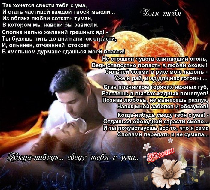 Когда я думаю о тебе, тело мое трепещет, оно рвется к тебе, пылает от страсти, желания прижаться и ощутить нежность и легкий аромат твоей кожи. Помоги мне унять свое дикое желание быть с тобой рядом.