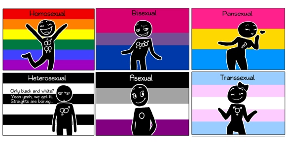 Сексуальная ориентация обычно делится на несколько категорий: гетеросексуальность , влечение к лицам другого пола; гомосексуальность влечение к лицам своего пола; бисексуальность влечение к лицам обоего пола; асексуальность , отсутствие сексуального влечения или стремления к сексуальным контактам; пансексуальность , влечение к людям независимо от пола, пола, гендерной идентичности или гендерного самовыражения; омнисексуальность , влечение к людям любого пола, пола, гендерной идентичности и гендерного самовыражения, учитывающее пол человека, и queer , общий термин, используемый для описания сексуальной ориентации, гендерной идентичности или гендерного самовыражения.