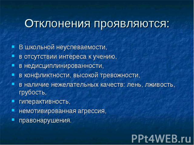 Так, более вспыльчивыми люди становятся при перегреве, нахождении в душном помещении, длительном воздействии шумов, вибраций. Самоконтроль ослабевает в ситуации стресса, при усталости, болевых ощущениях, половом возбуждении. - Поведенческие. К данной группе факторов относится любое поведение, которое расценивается окружающими как неприемлемое, вызывает ответную защитную реакцию. Например, агрессивность ребенка бывает связана с бесцельным времяпрепровождением, прогулами уроков, употреблением алкоголя – поступками, вызывающими осуждение родителей, педагогов.
