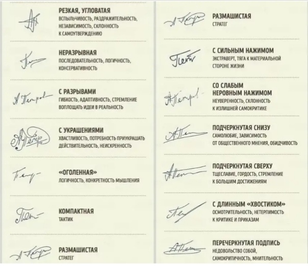 Ясные подписи, в которых можно с легкостью прочитать буквы, говорят о любви человека к окружающим, стремлении заботиться о своих ближних. И наоборот, заковыристые, неразборчивые подписи свидетельствуют об эгоистичном характере их владельца – его не волнует мнение окружающих.