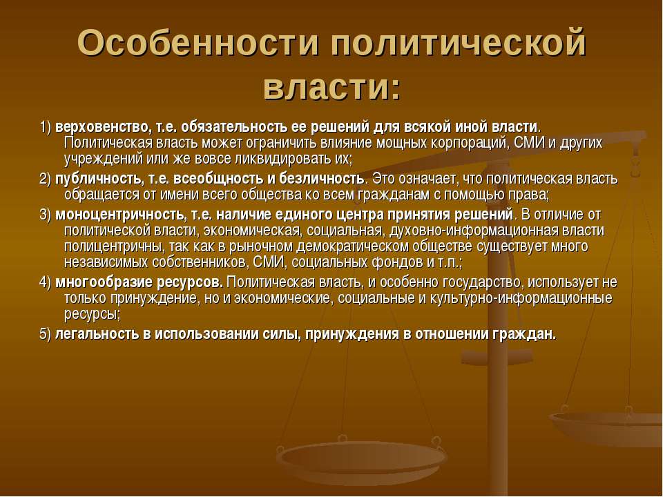 Мотивация подчинения достаточно сложна. Она может основываться на страхе, на привычке к повиновению, на убеждении в необходимости подчинения, на авторитете, на заинтересованности в повиновении и т.д. Все эти мотивы влияют на силу власти. 3. Особенности политической власти Выделяют следующие особенности политической власти : 1. Социально-необходимый характер государственной власти, вытекающий из логики человеческого общежития и выражающиеся в постоянном повышении уровня организации, степени упорядоченности в социальном сообществе и пространстве.