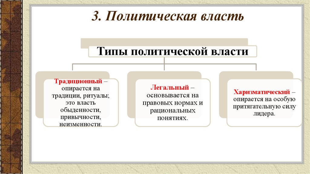Власть и есть та основа, которая определяет политику; власть существует везде, где есть совместная деятельность; это необходимый атрибут общественных отношений, суть которого заключается в переводе материальных и духовных интересов и сил в совместное действие.