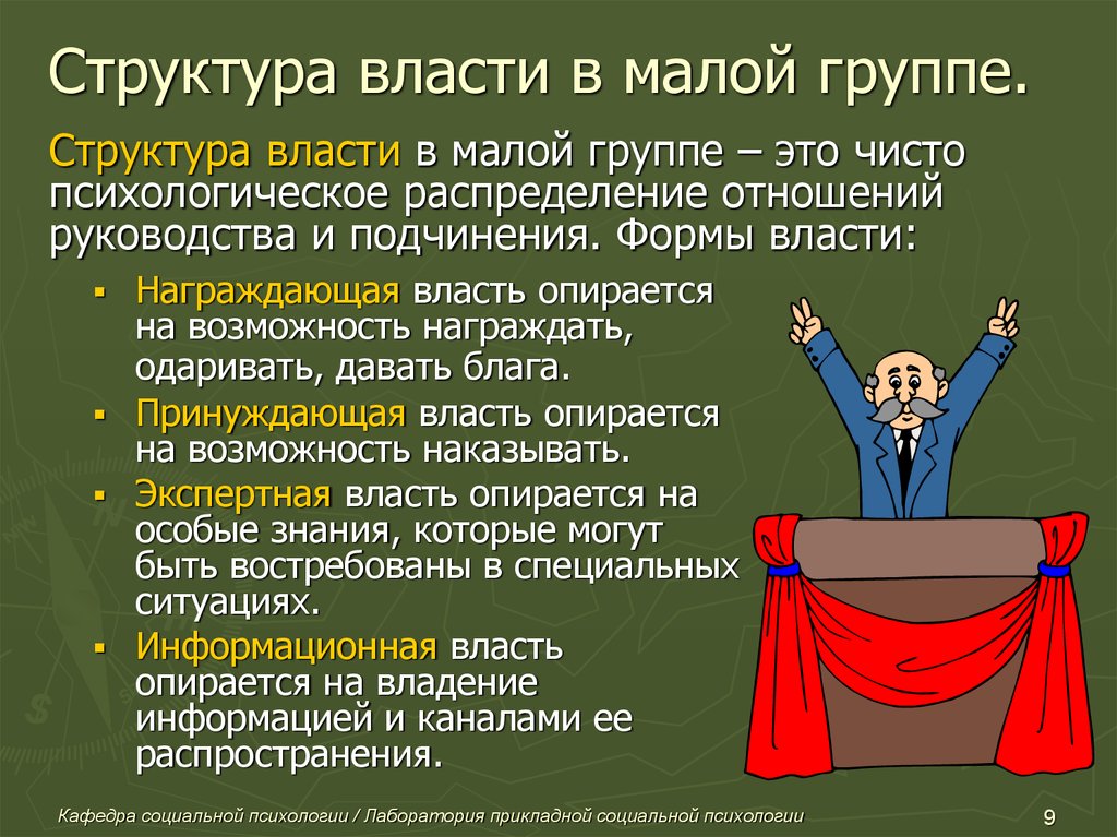 Большинство людей не испытывает психологического удовольствия от обладания властью, власть сама по себе не является для них ценностью, многие вообще предпочли бы уклониться от руководящих должностей и связанных с ними психологической и социальной ответственностью, если бы власть не открывала широкие возможности для получения различного рода благ.