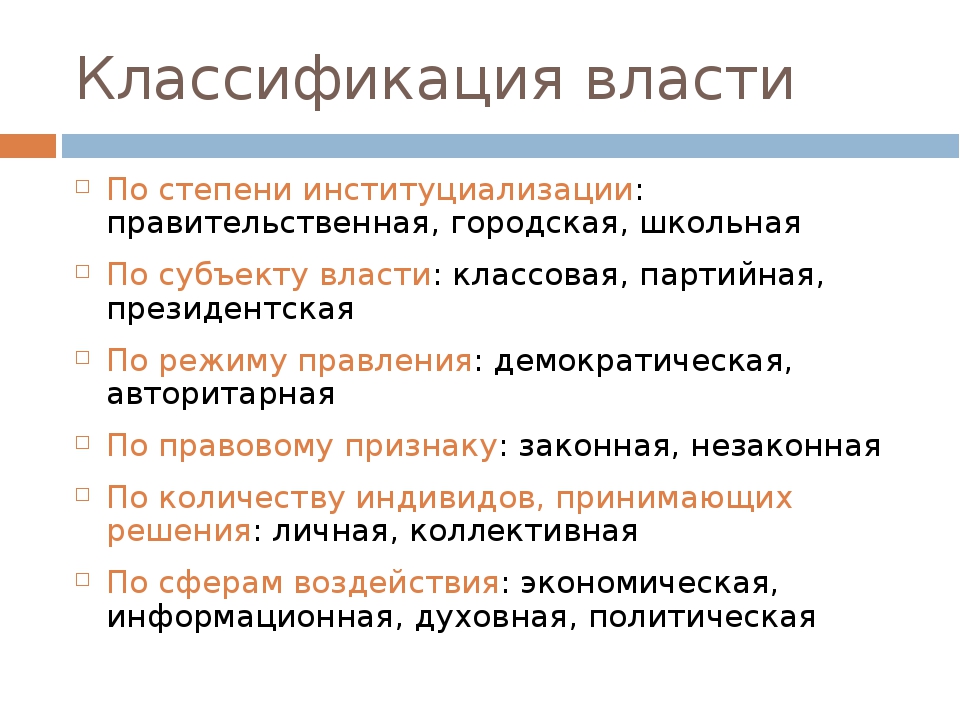 Философы говорят о власти над объективными законами общества, социологи — о власти социальной, экономисты — о власти хозяйственной, юристы — о государственной власти, политологи — о политической власти, естествоиспытатели — о власти над природой, психологи — о власти человека над самим собой, родители — о семейной власти, богословы — о власти от Бога и т. д. и т.п. Используется понятия законодательной, исполнительной и судебной власти.