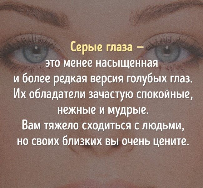 Серые глаза в чистом виде тоже встречаются довольно редко, чаще они с зеленоватым или голубым оттенком. Если же вы видите обладателя чисто серых глаз, вам повезло — это надежный и спокойный человек. Эти люди не склонны к изменам и ветрености.