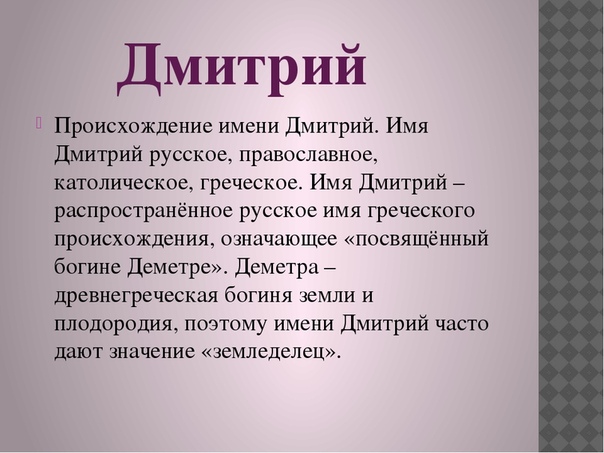На характер и судьбу имени Дмитрий значение имени оказывает самое большое влияние. Дмитрий — русский вариант греческого имени Деметрий, которое в свою очередь происходит от имени Деметры — мифологической богини плодородия и земледелия. Таким образом расшифровка имени Дмитрий — «преданный богине Деметре» или «принадлежащий Деметре». У древних славян имя звучало как «Дьмитр» или «Дмитр», позднее была образована церковная форма «Димитрий». Расшифровка имени Дима такая же, как и имени Дмитрий, так как это основное и общепринятое сокращение.